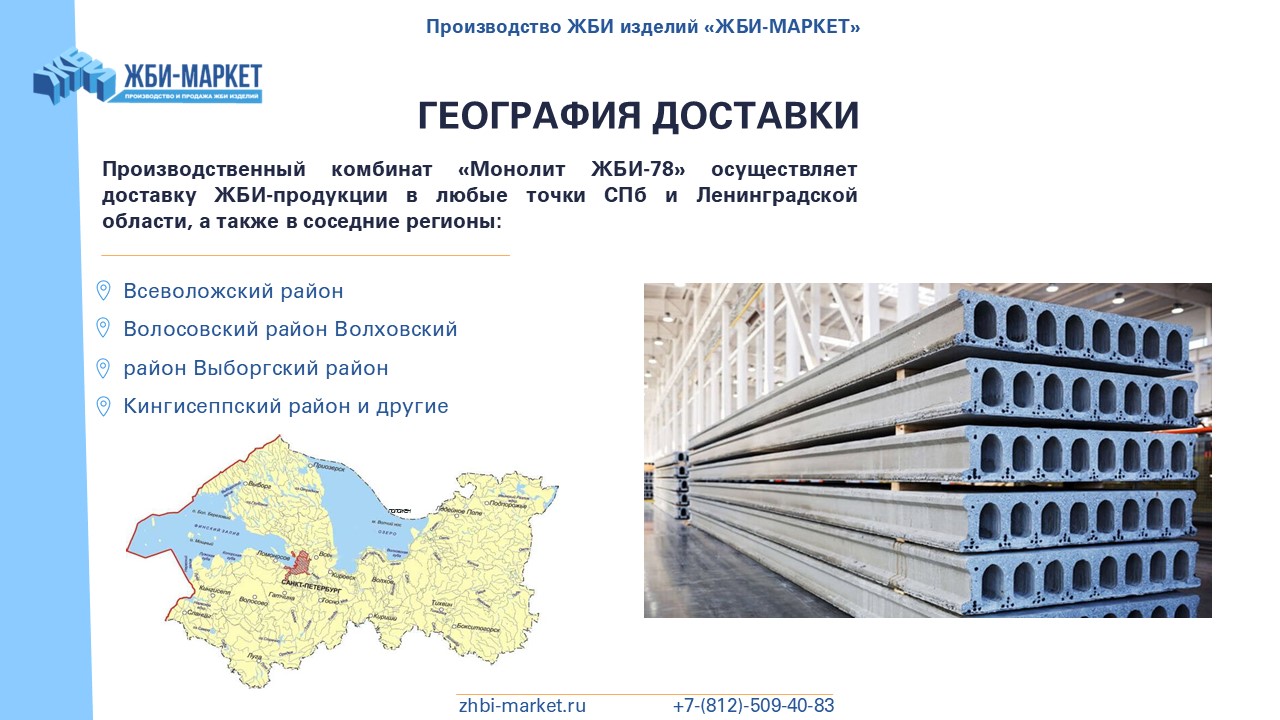 У нас есть 8 крупных складов в Ленинградской области, 3 собственные производственные площадки и 7 заводов-партнеров. Благодаря этому мы можем предложить нашим клиентам широкий выбор качественных железобетонных изделий по низким ценам, которые всегда в наличии на наших складах.